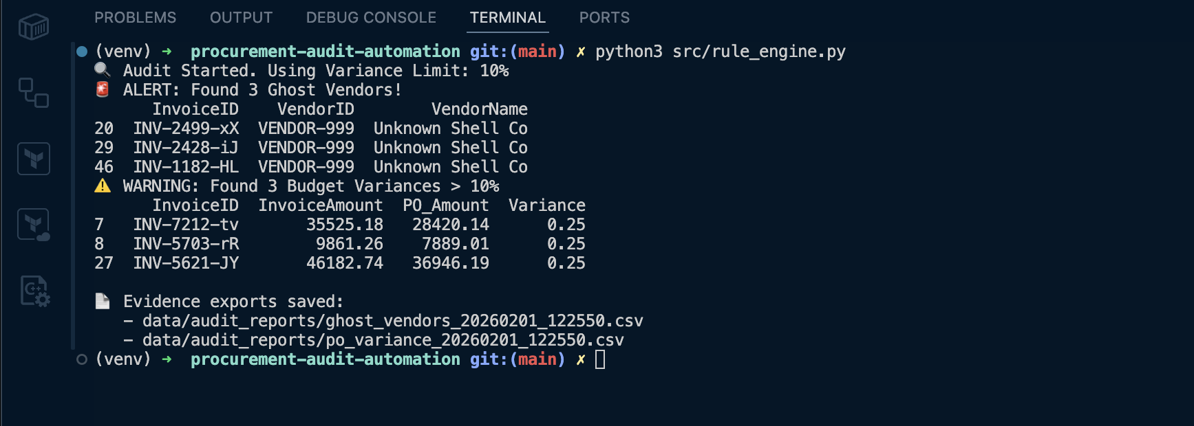 Procurement exports often contain exceptions that are easy to miss in spreadsheets. This project converts those risks into traceable exception reports that can be reviewed quickly and exported as evidence.