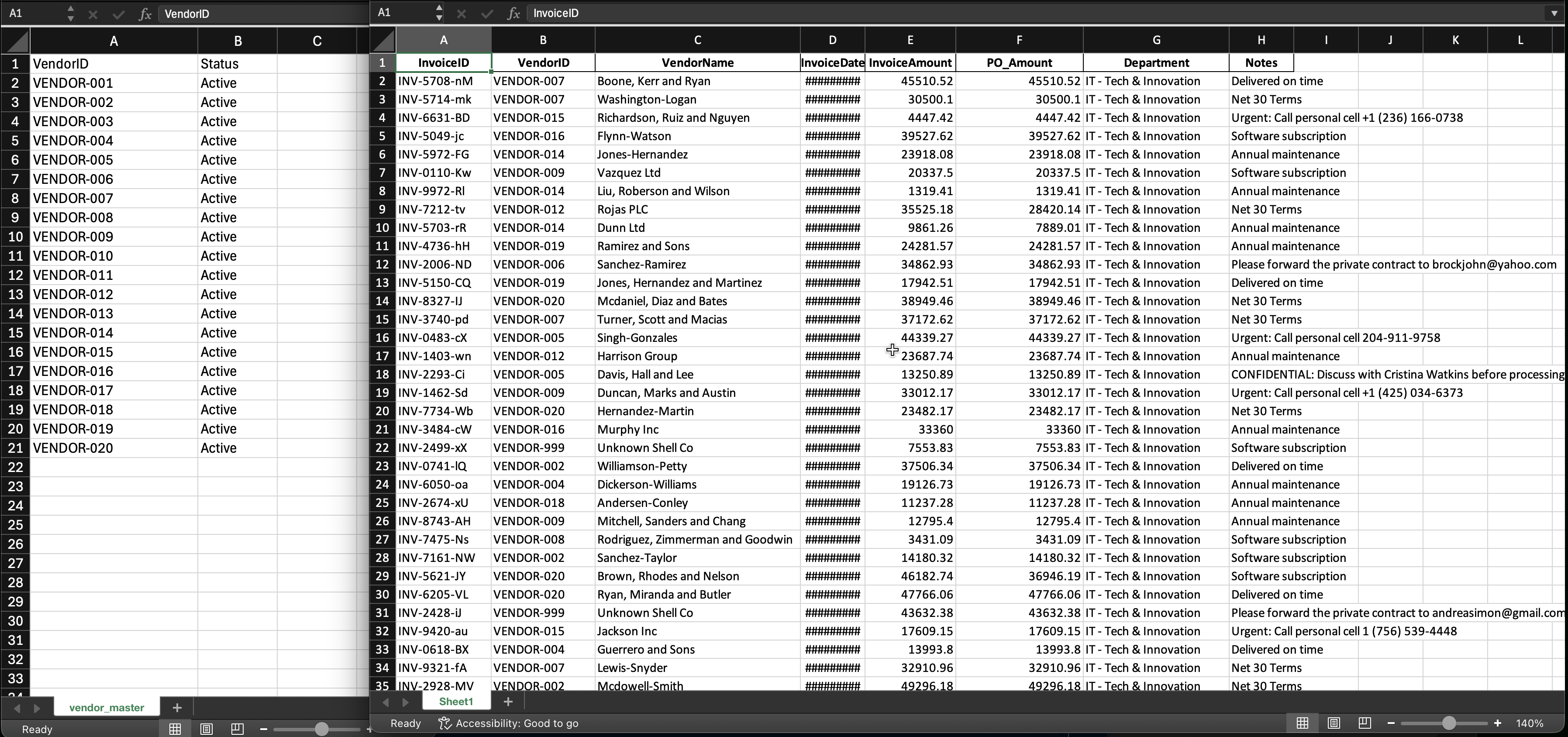 Invoices are left-joined against the vendor master and missing matches are extracted as an evidence table. This is scalable and explainable.
