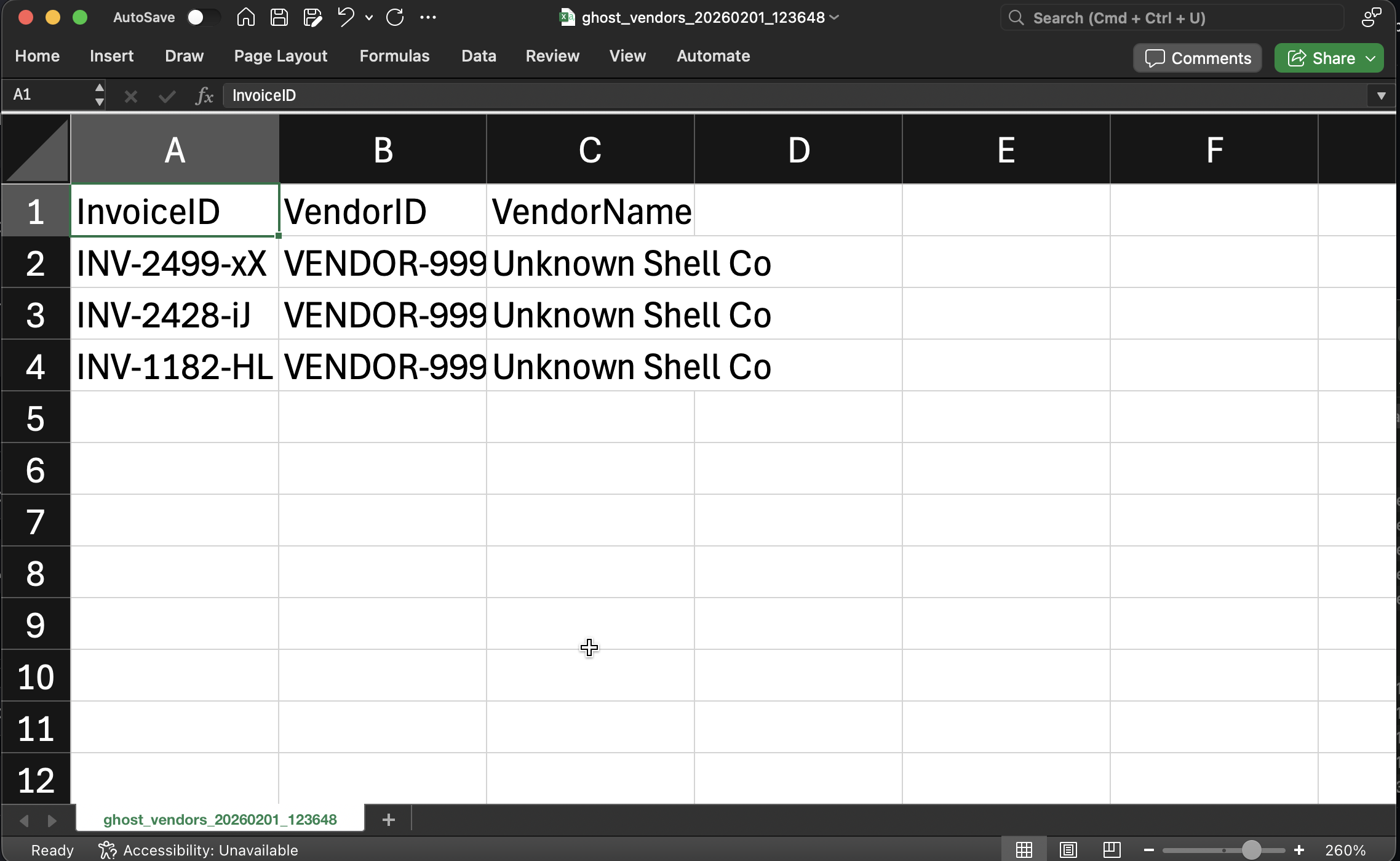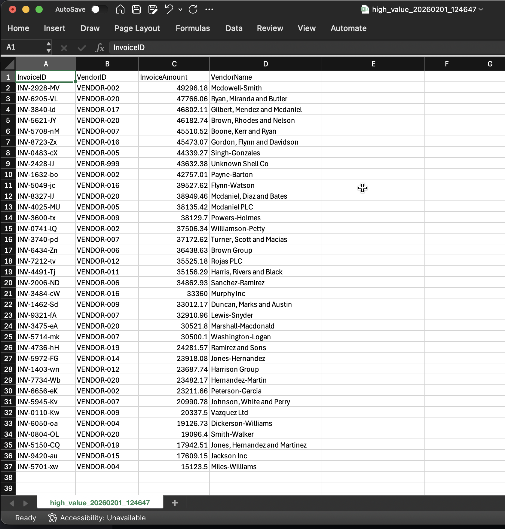 Ghost vendor detection, PO variance computation, and high-value invoice flagging using deterministic logic.