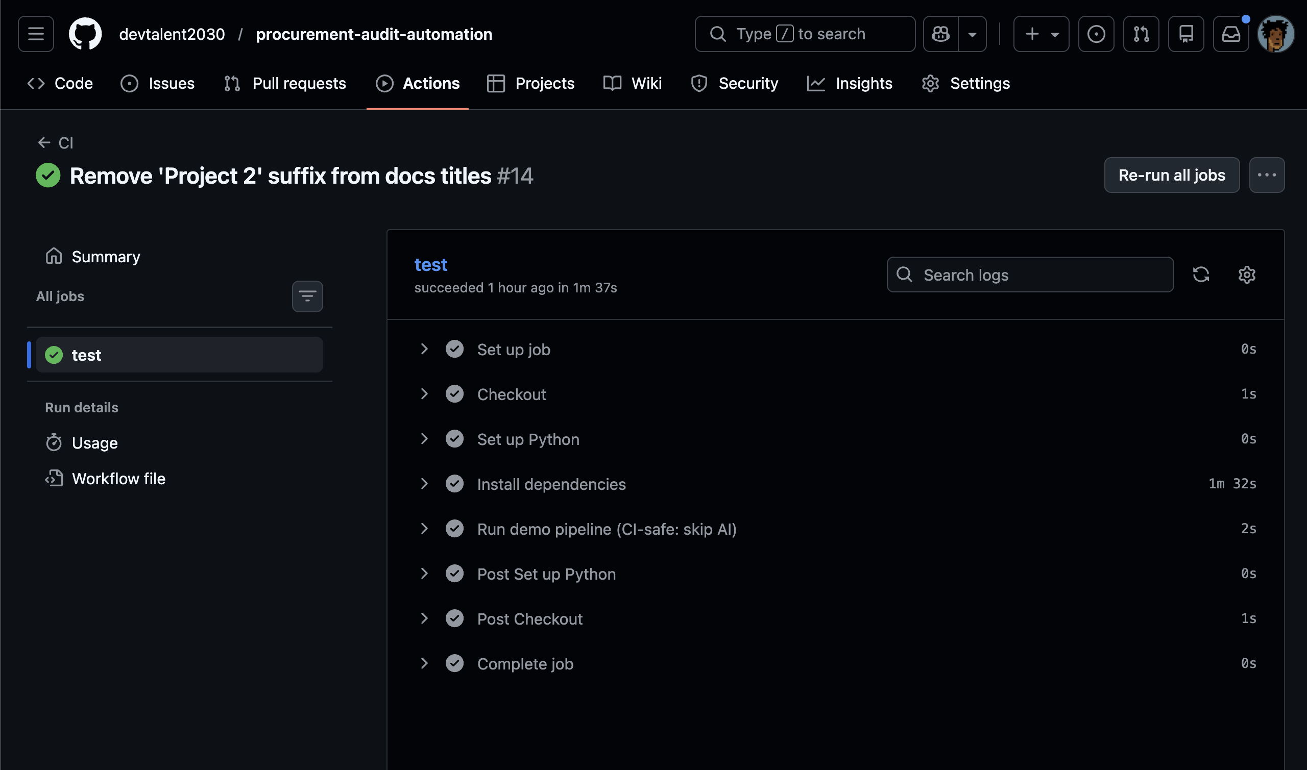 CI validates deterministic logic + tests reliably. The AI step can be toggled off with SKIP_AI=1 to keep CI stable while preserving full local demos.