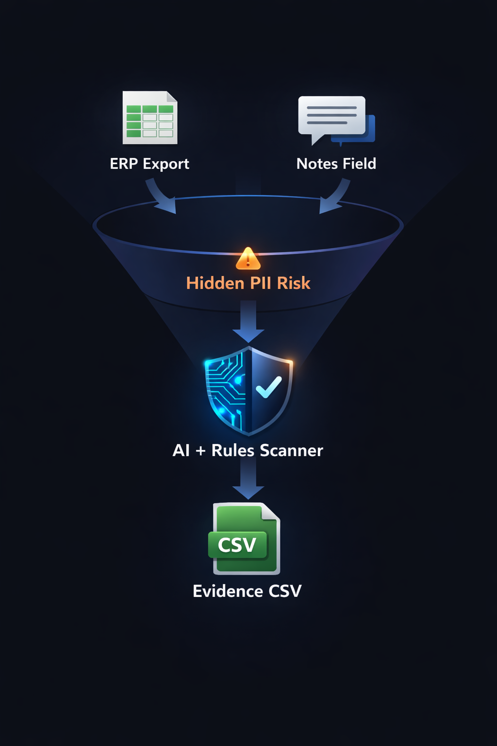 Goal: Catch privacy-risk text inside Notes / Comments / Description fields before exports get shared, emailed, archived, or turned into reports. This is a fast pre-screen that produces evidence tables for review (not a legal determination).